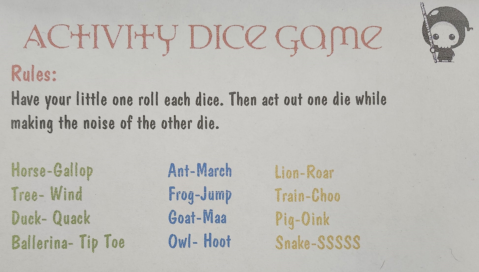 Have your little one roll each die. Then act out one die while making the noise of the other die. instructions included.