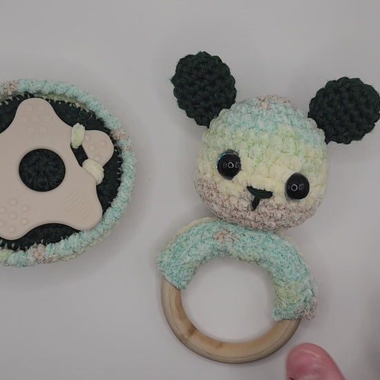 Made with baby chunk yarn and safety eyes. Has a traditional wooden handle rattle. Also has a sensory texture crinkle teether with a silicone teething star.
