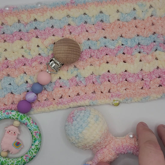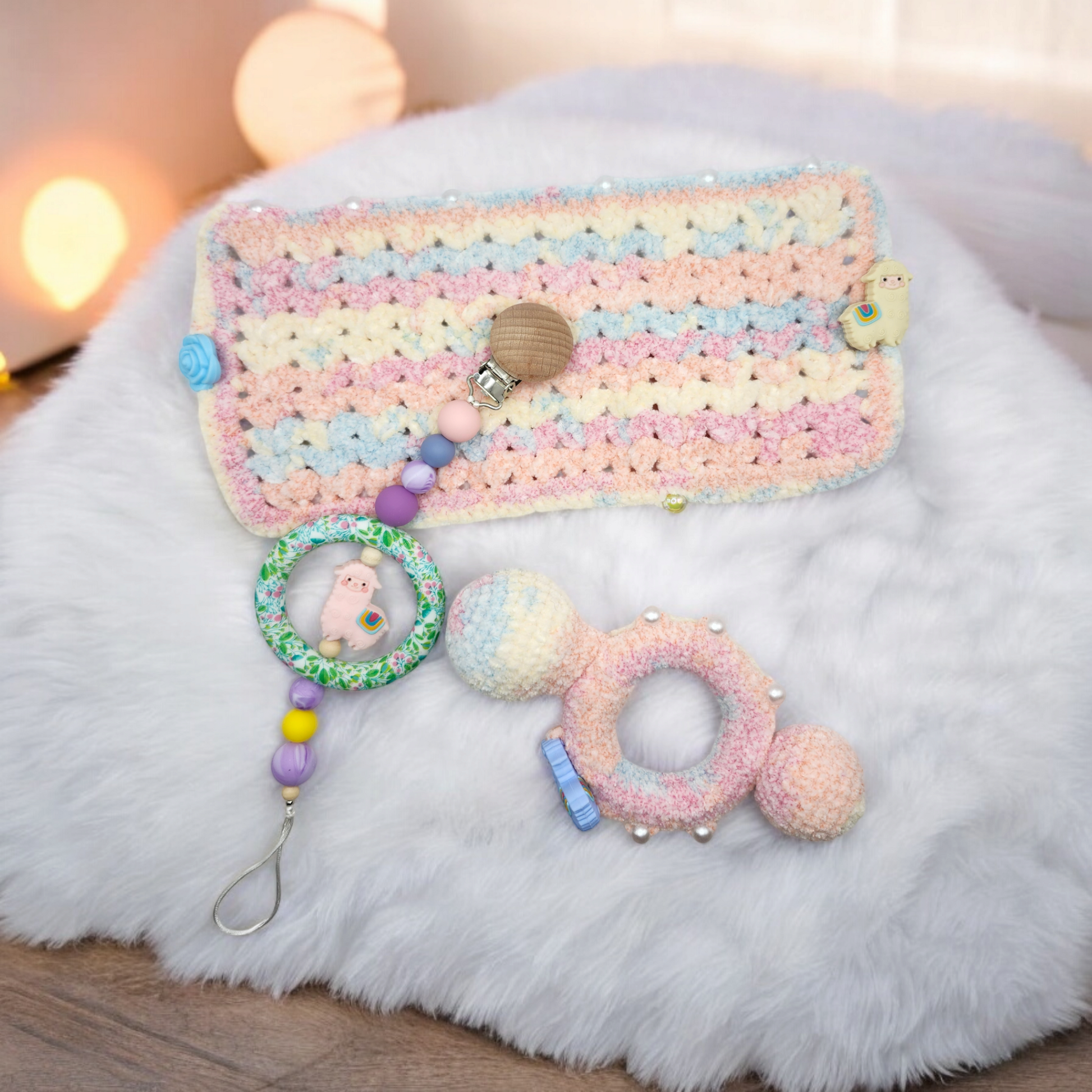 Teether Ring has a rattle and a squeaker end for extra sensory. Also made with acrylic pearl beads for teething fun.