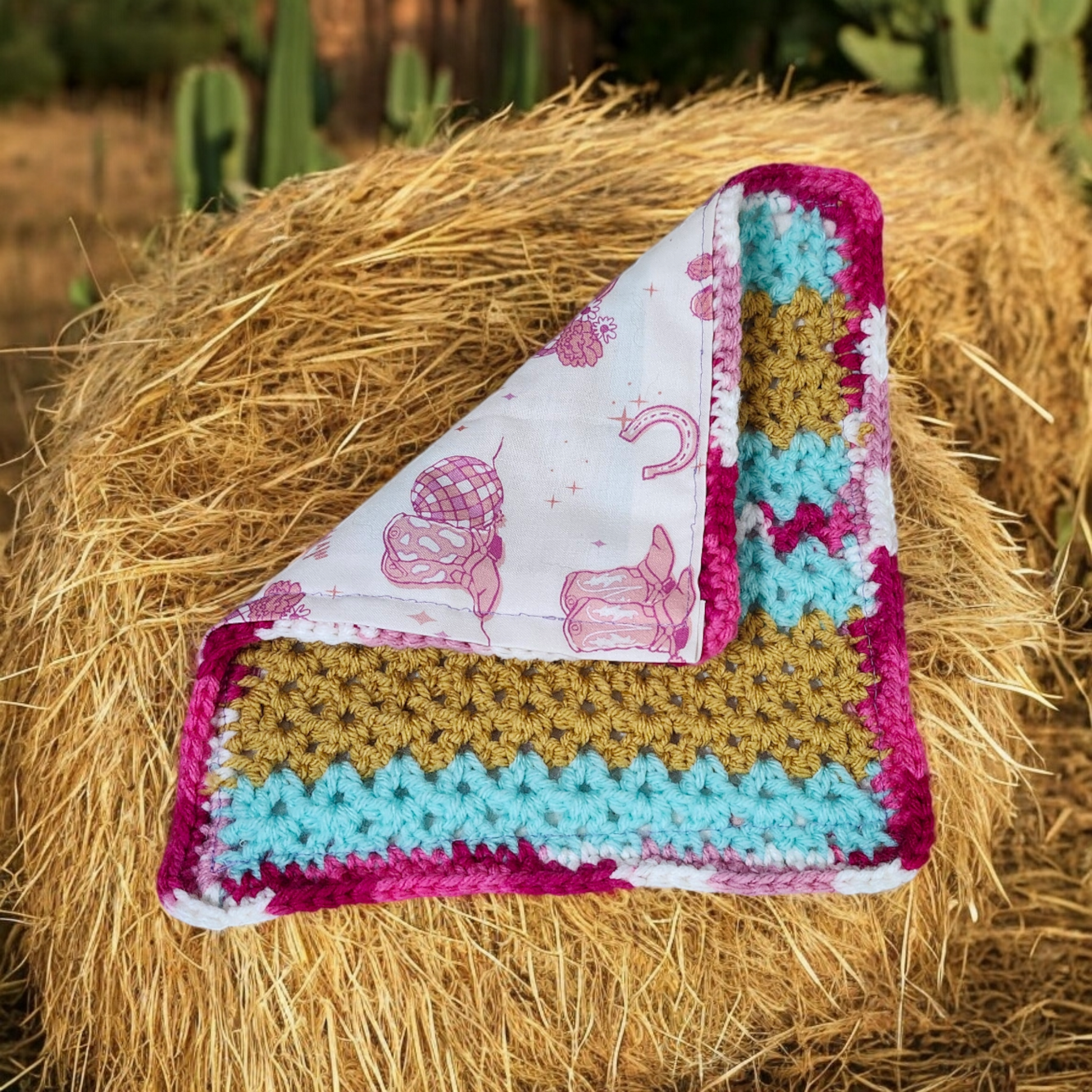 This double sided burp cloth is hand made and sewed with my machine....I'm all for hand stitching, but I'll admit when I'm lazy and use a machine!