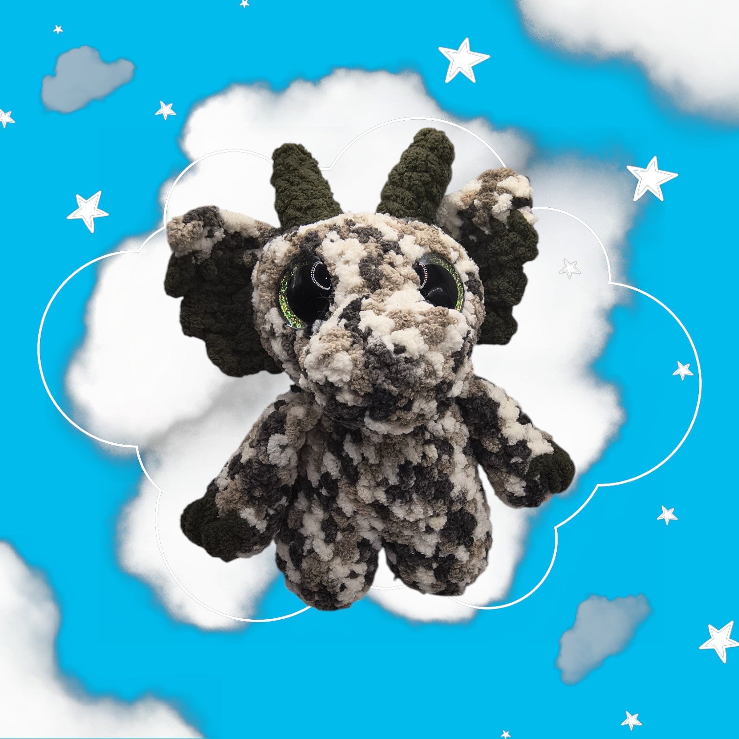 Made with safety eyes. 9" from bottom top of horns.