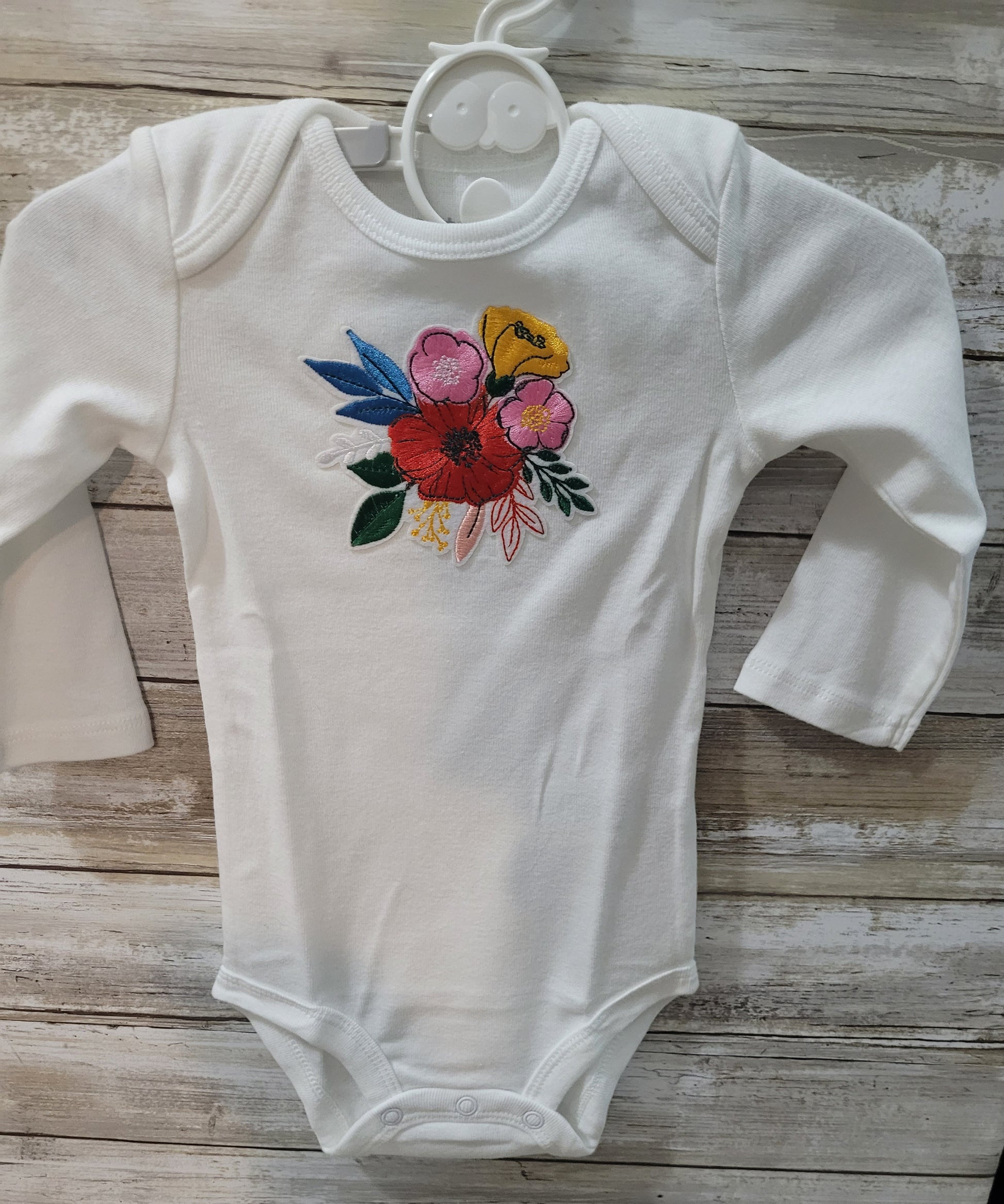 6-9 months long sleeve onzie with gorgeous flowers added to it.