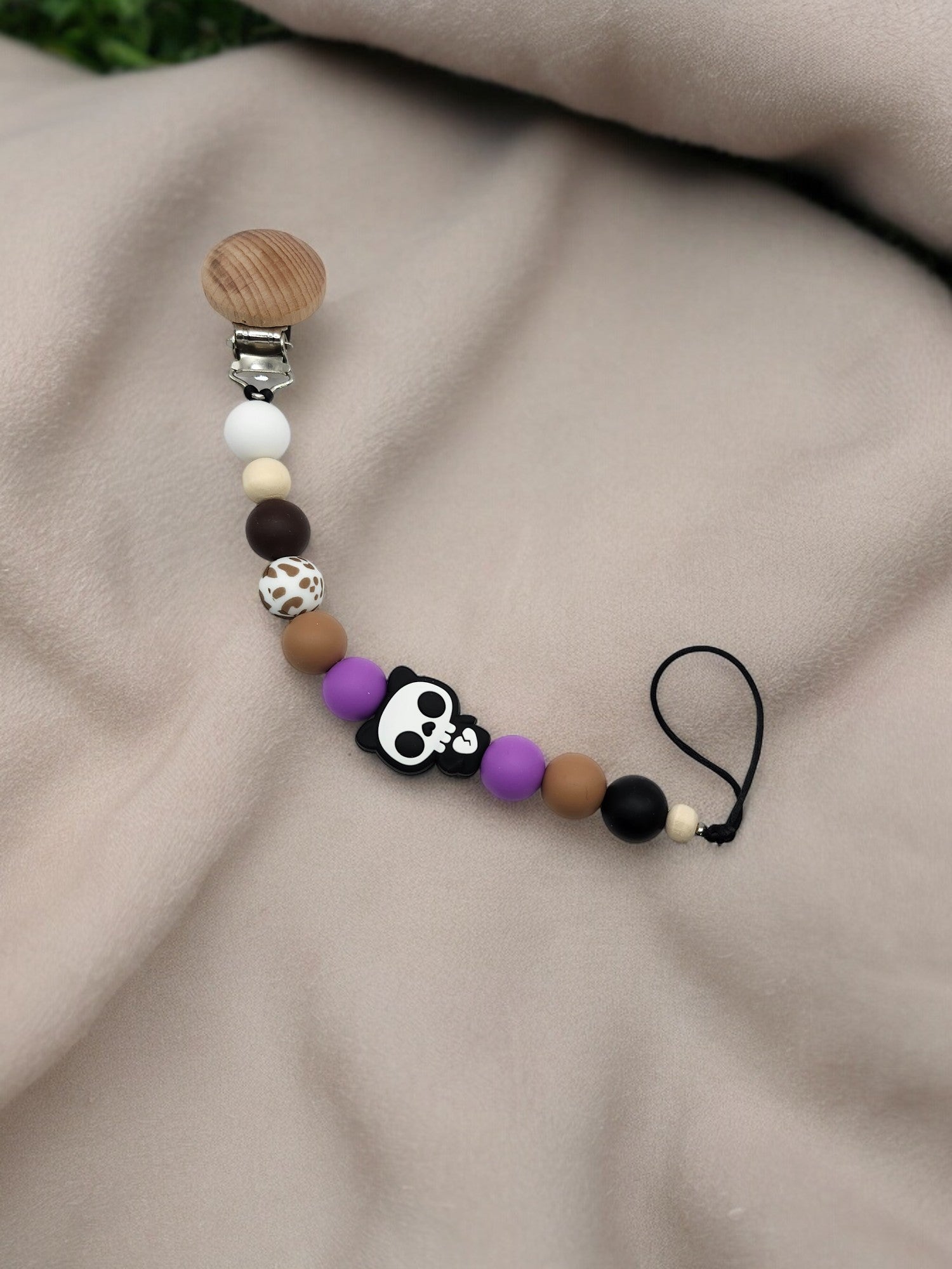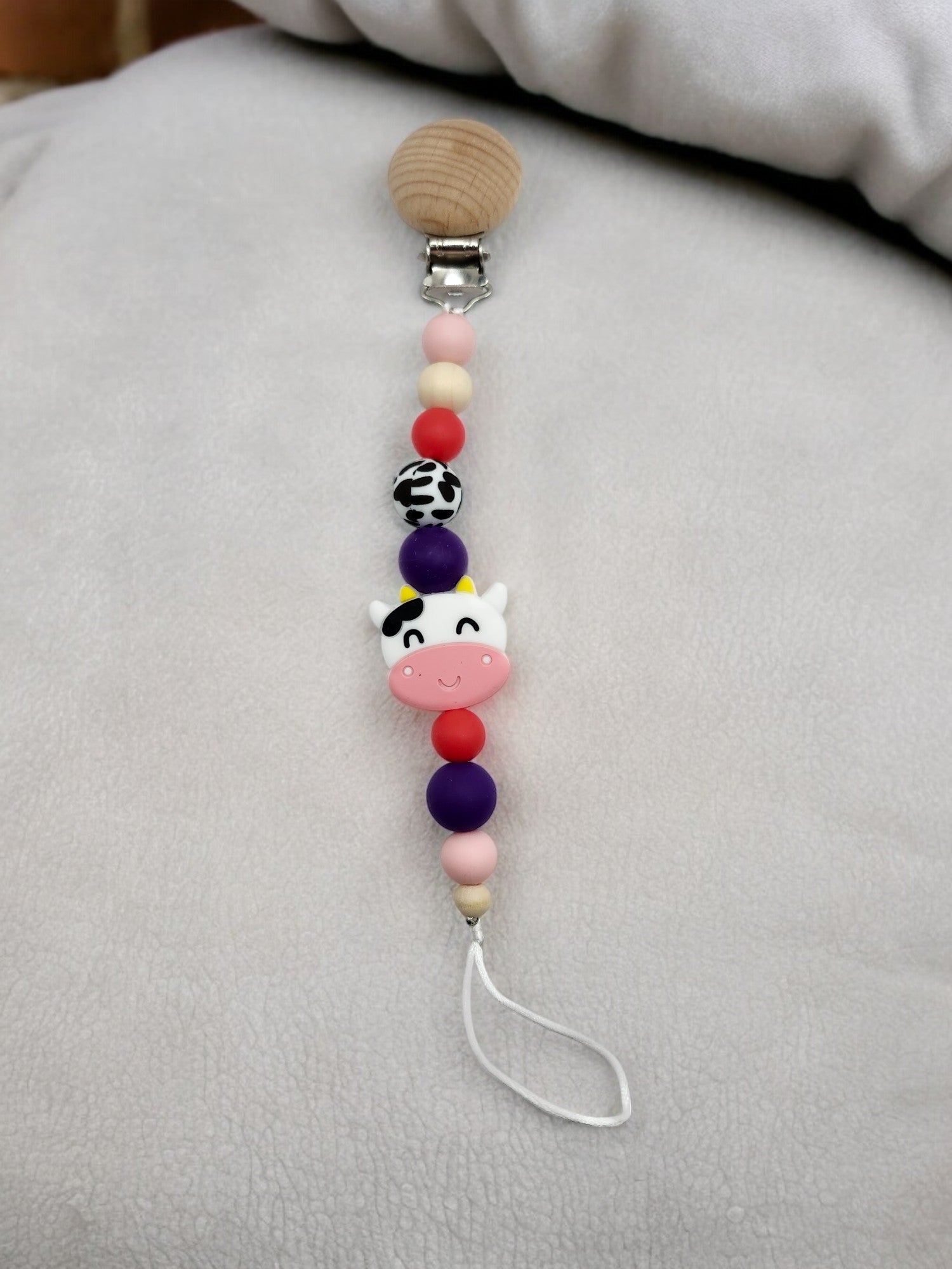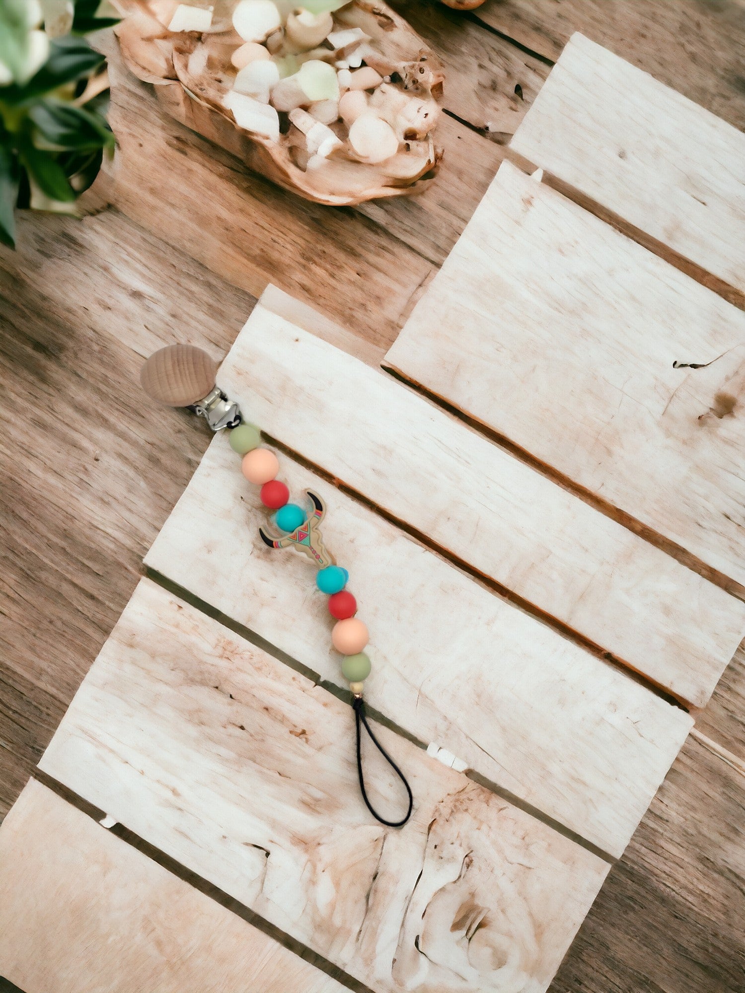 All Pacifier Clips are made with all natural beech wood and baby safe teething beads. Each Clip is 2 safe clamps to add extra safety for baby and improve the longevity of each clip. Safety clamps are hidden from baby.