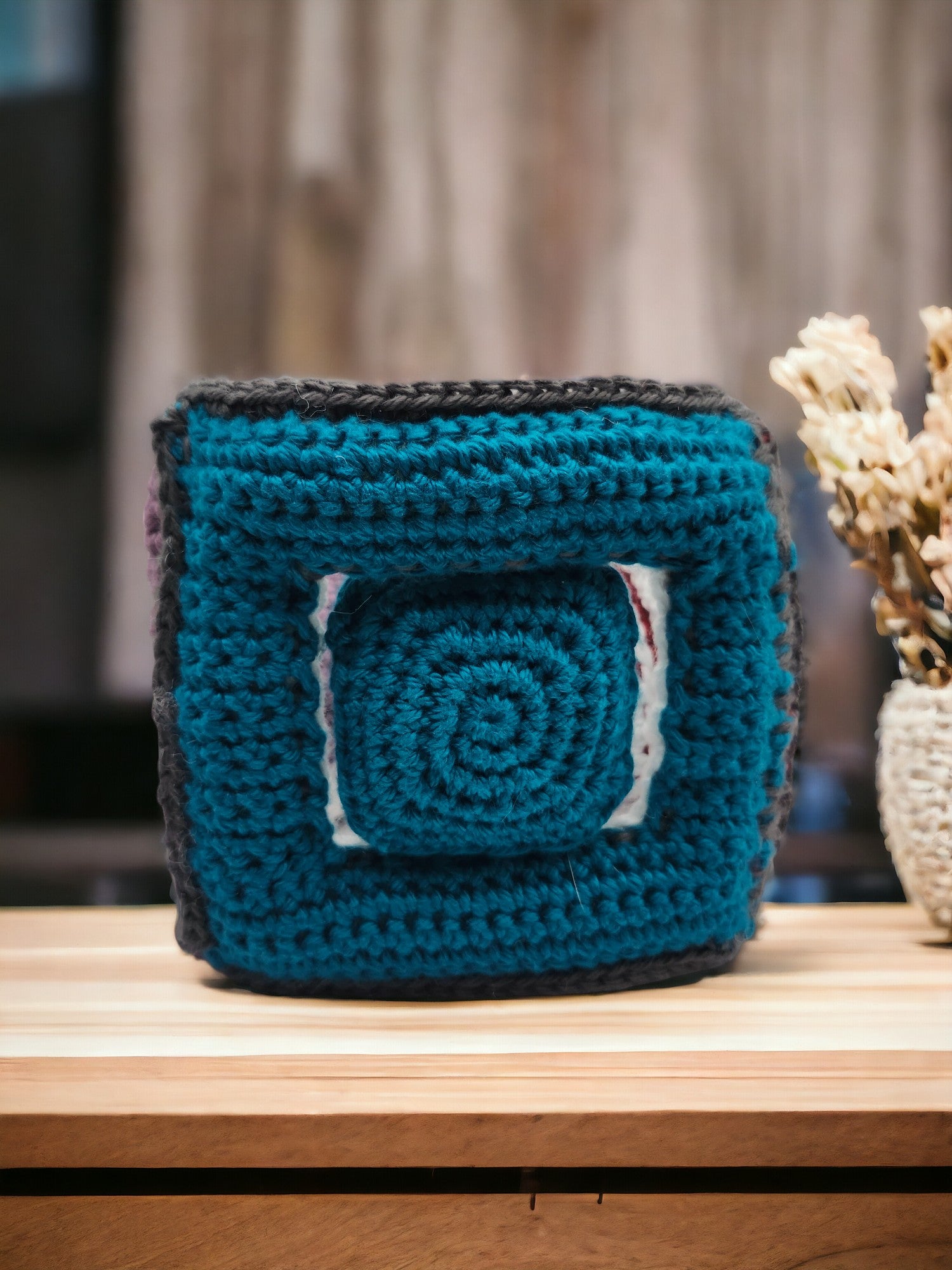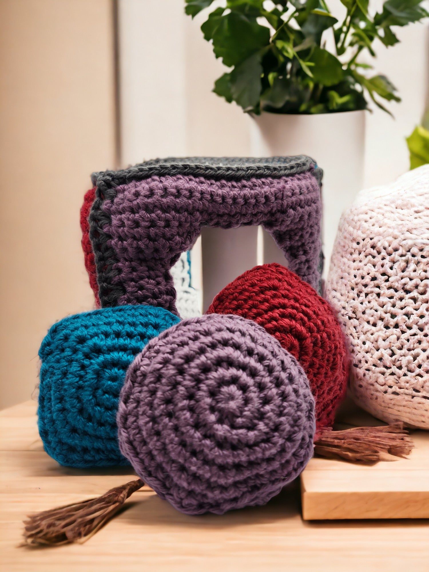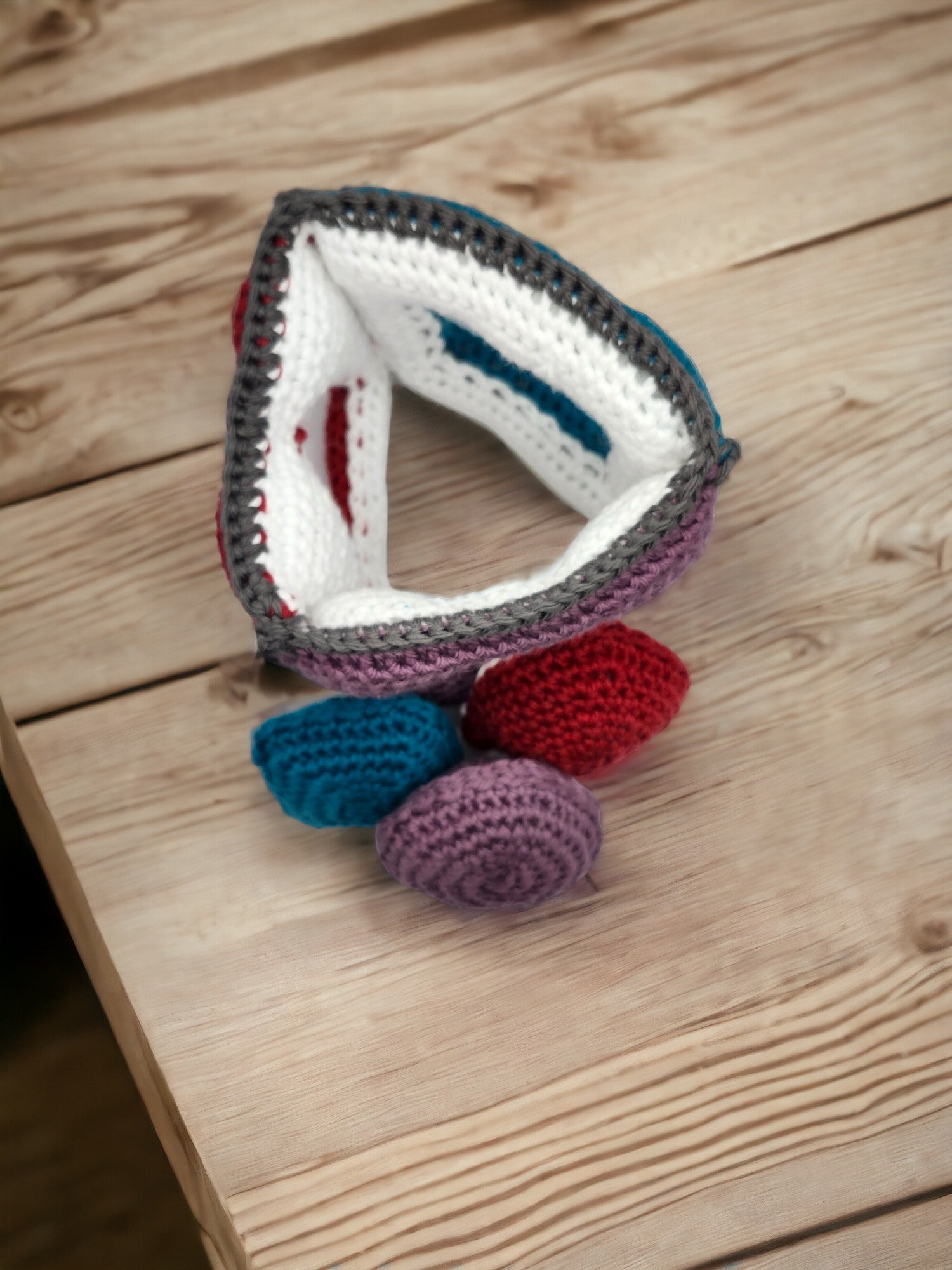 This is a 3 sided crocheted learning triangle. Circle, Square, and Triangle.