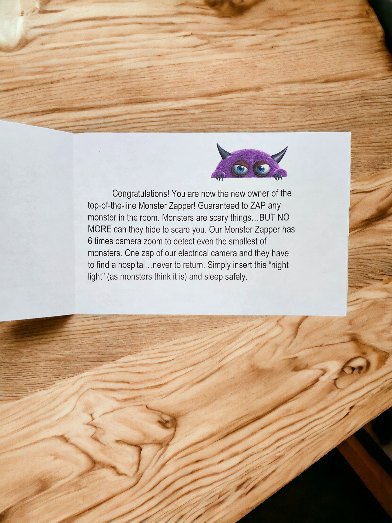 These are our new Monster Zappers (nightlights). They come with a cute little pamphlet for you kids to read the guarantee. No monsters are able not to be sent to the hospital after the ZAP! Never to return! No monster can hide from the 6 time camera.
