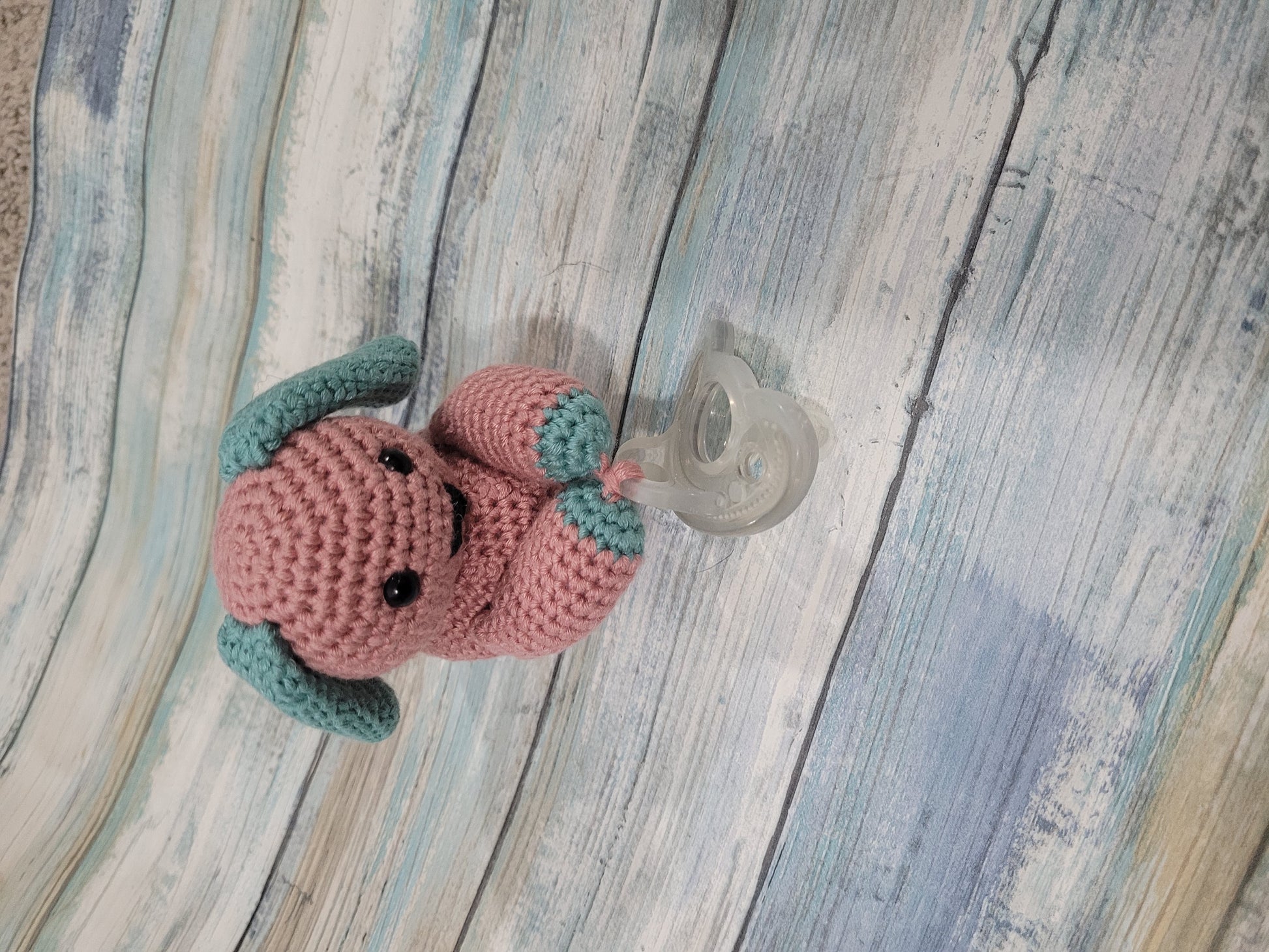 Made with safety eyes and a 0-3 month Nuby pacifier.