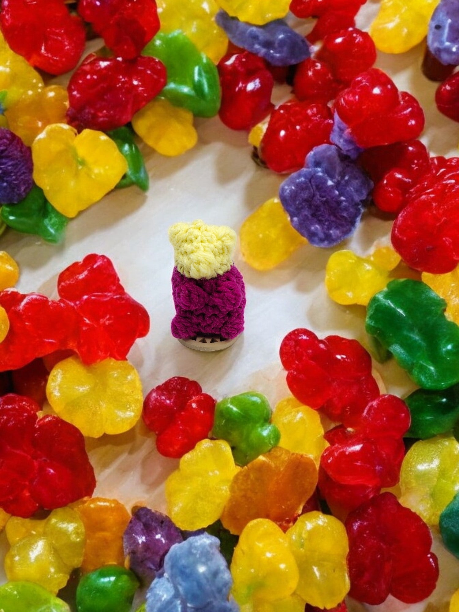 This is a super cute little gummy bear. Made with Tiny Grim quiet rattle.