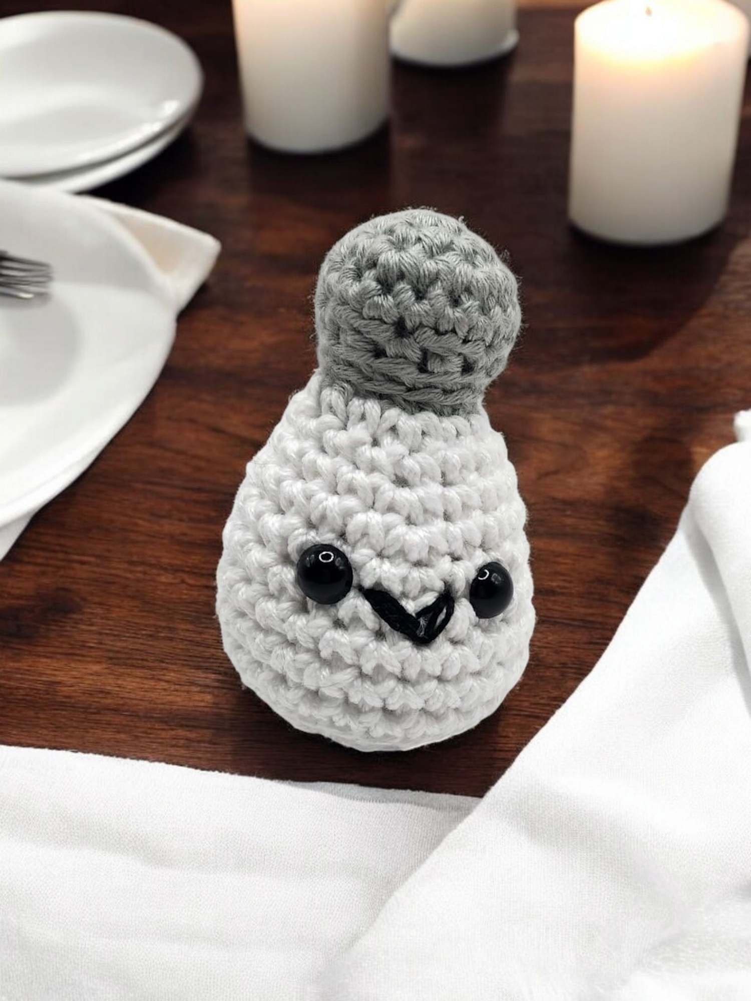 Made with atiny Grim quiet rattle and safety eyes. 3 inches tall