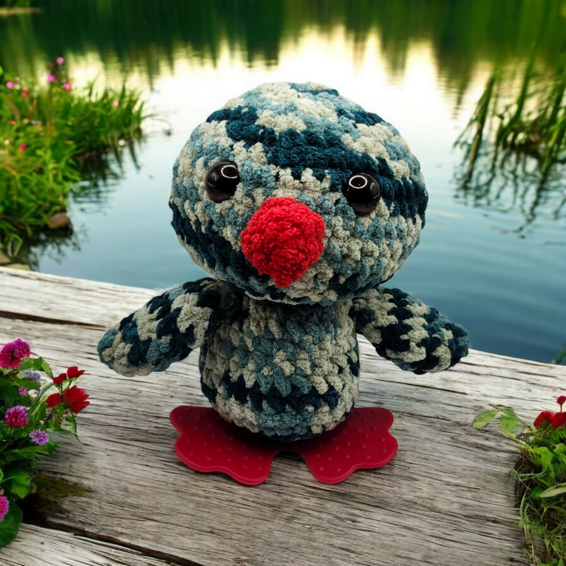 Made with chunk yarn. Safety eyes, and teething silicone feet.