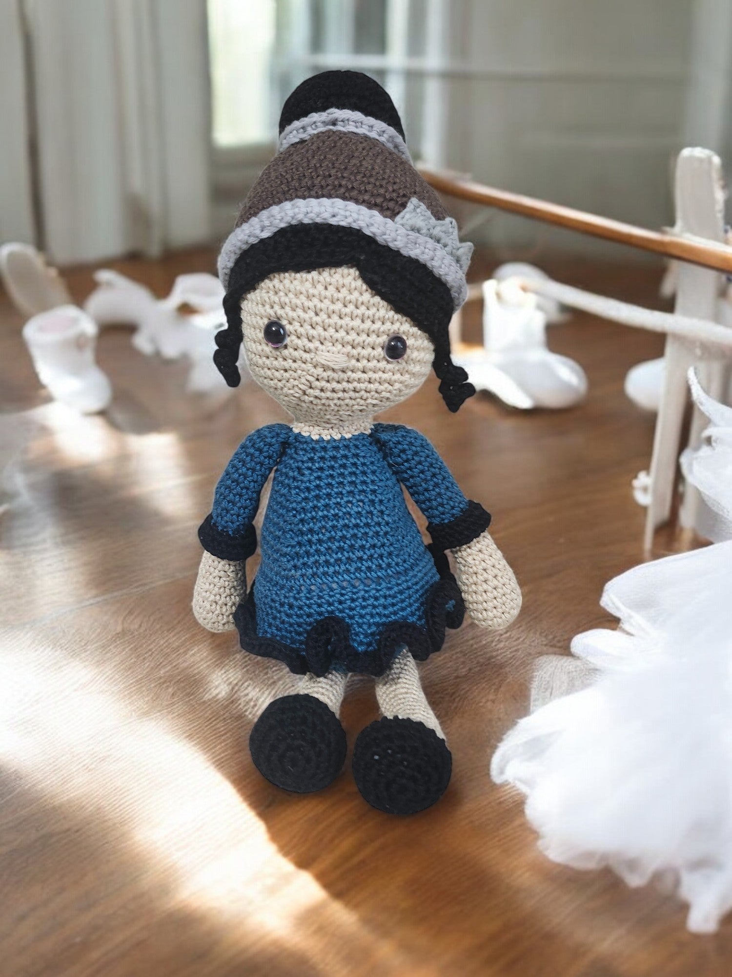 Made with safety eyes. a little oner 12 inches from top of hair to bottom of feet. This little ballerina is ready to play!